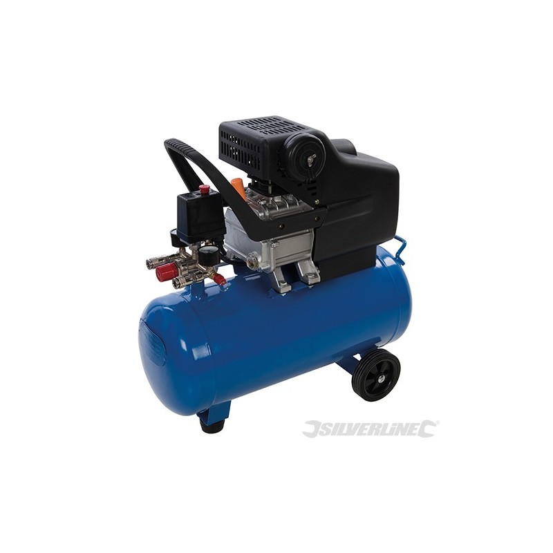 Portable air compressor, ideal for use in the garage and DIY workshop. Reliable 1500W (2hp) motor and durable oil-lubricated, air-cooled, single-stage pump. Powers a wide variety of air tools. 24Ltr pressure tank with max air flow of 144Ltr/min and 8 bar (116psi) max working pressure. Automatic start/stop pressure switch. Extensive safety features include safety valve and thermal cut-out. Includes 2 x 3-in-1 quick connectors, air intake filter, oil bottle and portability kit.