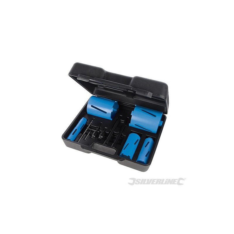 Odolné jádrové vrtáky s ocelovým tělem a diamantovými řeznými zuby. Ideální pro řezání přesných děr ve zdivu na sucho. Používejte s vrtačkami s bezpečnostní spojkou. Nepoužívejte příklep. Sada obsahuje 5 jádrových vrtáků (38, 52, 65, 117 a 127 mm), 2 upínací stopky, středící vrták a vyrážecí klín.