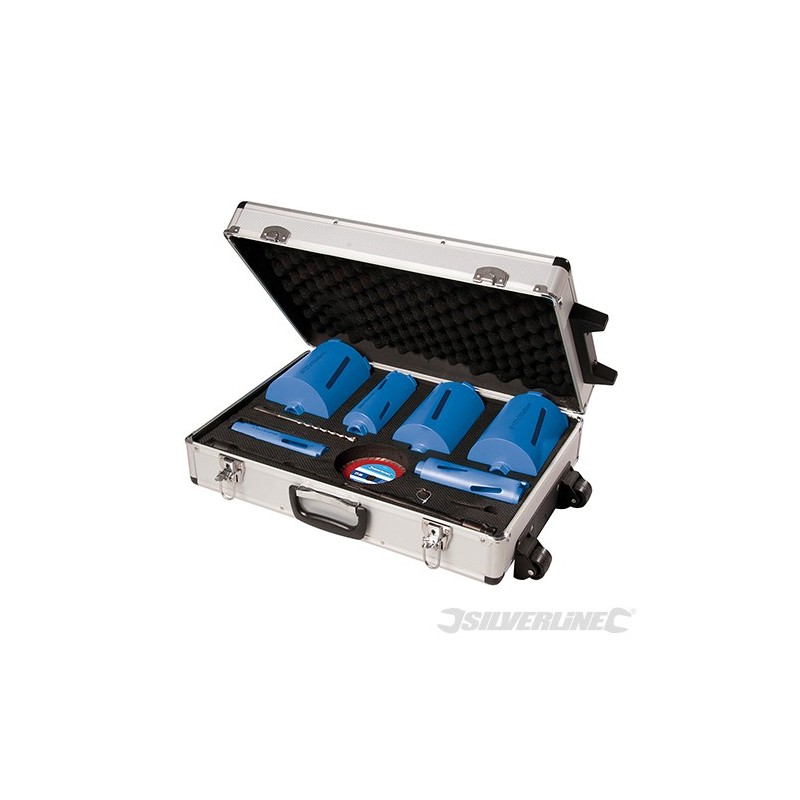 Odolné jádrové vrtáky s ocelovým tělem a diamantovými řeznými zuby. Ideální pro řezání přesných děr ve zdivu na sucho. Používejte s vrtačkami s bezpečnostní spojkou. Nepoužívejte příklep. Sada obsahuje 5 jádrových vrtáků (38, 52, 65, 107, 117 a 127 mm), 2 upínací stopky, středící vrták a vyrážecí klín.