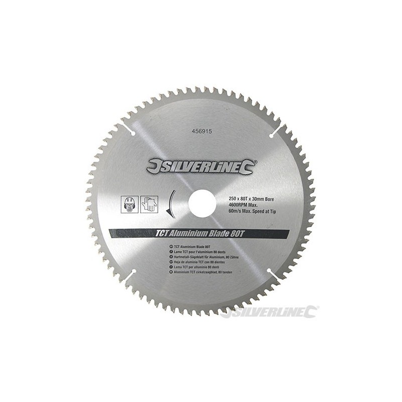 Pro řezání neželezných kovů, lehkých kovů a hliníkových profilů. Vysoký zkosený zub střídající se se zubem s plochou špičkou, wolfram-karbidový. 80 zubů. Úhel čela -5°. 30 mm upínací otvor s 25, 20 a 16 mm redukcí.