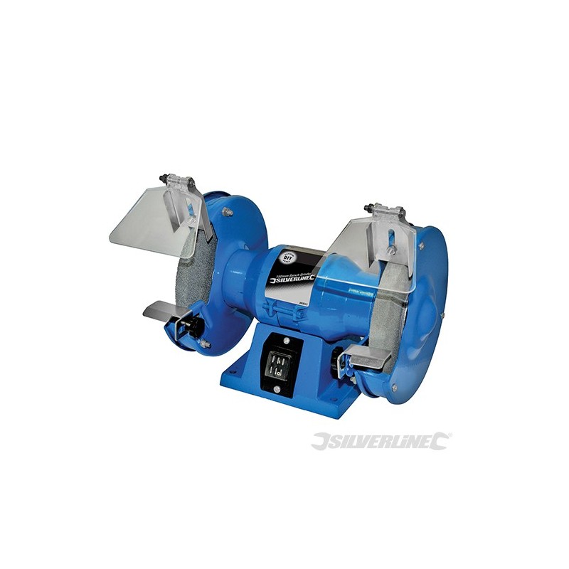 Kompaktní dvoukotoučová bruska s vypínačem s ochranou proti prachu a gumovými nožkami. 2 celoocelové opěrky na nářadí, velké ochranné štíty a kryty kol pro bezpečnost. Dodává se s brusnými kotouči s jemnou a střední zrnitostí.