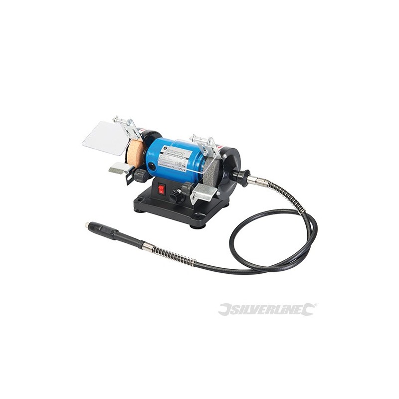 Versatile mini grinder and polisher with handy flexible drive shaft grinding attachment. Complete with fine (80 grit) grinding stone and polishing wheel. Adjustable eye protection shields, spark deflectors, wheel guards and tools rests.