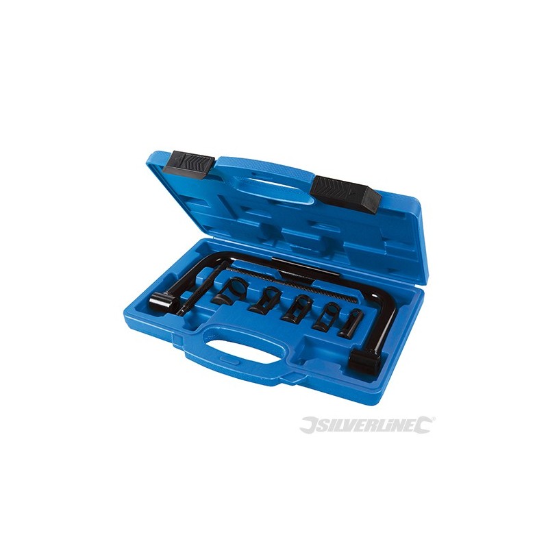 Strong carbon steel construction with black phosphate finish. For installing and removing engine valves on small engines. Pressure winding handle with 3 x extension bolts. Includes 5 x open sided adaptors: 16, 19, 23, 25, and 30mm; winding T-bar handle and 3 x extension bolts; C-clamp and tough storage case.