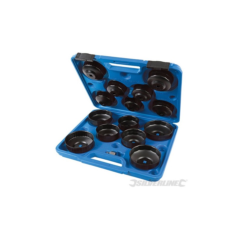 Chrome vanadium steel cup-type sockets with anti-rust, electro-black oxide finish. For removing and installing different sized oil filters on various vehicle models. Socket-like grip minimises risk of crushing filters. For use with 3/8" or 1/2" square drive wrenches. Includes 36 face cup (96mm), 30 face cup (76mm), 7 x 15 face cup (74/76, 75/77, 80, 80/82, 90, 93 & 100mm), 1/2"-3/8" adaptor and tough storage case.