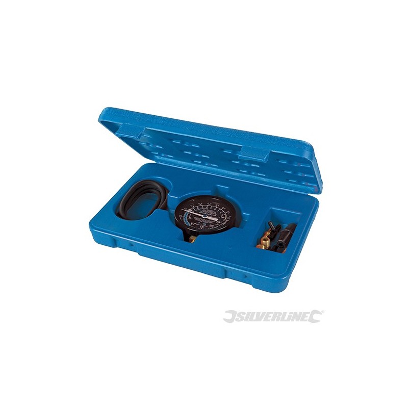 80mm dia gauge with protective rubber bumper and hanging hook. For testing leaks in fuel lines, vacuum chokes and heating systems. Also suitable for diagnosing problems with engine valve timing. Includes long, flexible hose; brass adaptors; T-type adaptor; connectors and blow-moulded storage case.