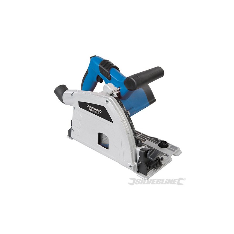 Plunge track saw features a cast aluminium base, blade guards and dust port. 165mm x 20mm blade with 24T tungsten carbide teeth cuts natural and composite woods. 2 x 700mm extruded tracks slot easily together from their compact state to create a 1400mm track with a non-slip base. Easily accessible shaft lock aids fast, convenient blade-change. Plunge lock for safety enhancement. Soft-grip handles. Includes guide track system for smooth, precise straight and bevel cutting. Bevel range: 0-45°. Max. cutting depth: 56mm. No load speed: 5200rpm.