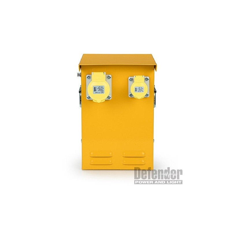Heater transformer with robust powder-coated metal casing. For running 110V heaters, including ceramic, fan and infrared, dehumidifiers, and also for use with lighting that uses a 16A socket. Collapsible twin handles allow a 2-person lift, offering safer manual handling option and enabling the transformer to be stacked. Centre-tapped to earth for extra safety. Outlets 1 x 16A and 1 x 32A. Continuous rating 3000W. Ingress protection IP44. No plug supplied. BSEN 61558-1 compliant. Dimensions: 220 x 280 x 380mm. Weight 3kg.