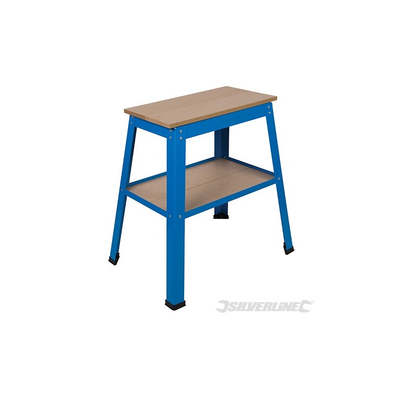 Silný ocelový rám, vestavěná skladovací police a odolný, práškově lakovaný povrch. Stabilní podpěra pro stolní okružní pily, pokosové pily, stolní vrtačky. 2-dílná horní police s označením úhlu a délky se rozšiřuje od 360 do 520 mm šířky tak, aby odpovídala různým velikostem strojů. Gumové nožičky snižují vibrace a nedochází k poškození povrchu.