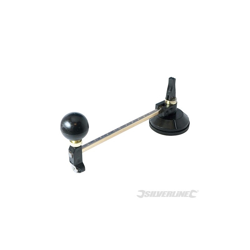 Řezací hlava se 6 řezacími kolečky z wolfram-karbidu. 55 mm přísavka drží řezačku na přesném místě. Ocelové řezací rameno s jasnou metrickou stupnicí. Vyřezává čisté otvory ve skle. Rozsah řezání od 65 mm - 300 mm v průměru.