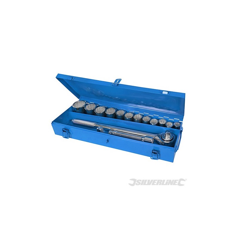 Chrome plated 3/4" set with single-piece forged ratchet handle with knurled grip and reverse direction lever. Powder-coated steel box. Includes T-bar and extension bar. Includes 12 x 12 point sockets: 22, 24, 26, 27, 28, 30, 32, 33, 36, 38, 41 and 46mm, T-bar and 200mm extension bar.
