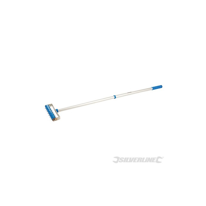 Durable polymer roller with hardened steel spikes on a telescopic anodised aluminium handle. Perforates wall coverings for fast removal of wallpaper using a steamer. Extendable twist-and-lock telescopic handle with ergonomic polymer handle and hanging holes. Effective on all types of wallpaper. Re-usable safety cover. Roller 150 x 40mm dia; length 580-1000mm.