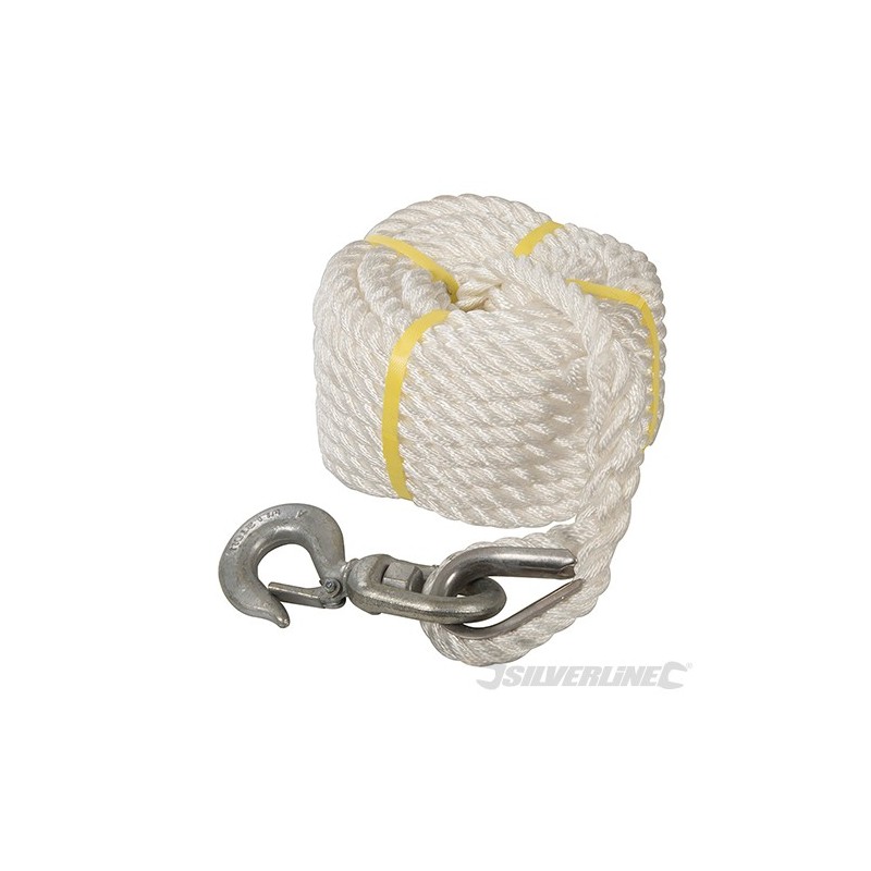 High-strength, 3-strand, synthetic 20m lifting rope with 2.5 tonne (2500kg) breaking strength. Fitted with 2 tonne (2000kg) capacity steel swivel karabiner with safety latch. Stainless steel reinforcing thimble eyelet. Long-life polypropylene (PP) multifilament rope with good chemical and fatigue resistance. Weight 4kg. Recommended for use with Silverline Gin Wheel (433531).