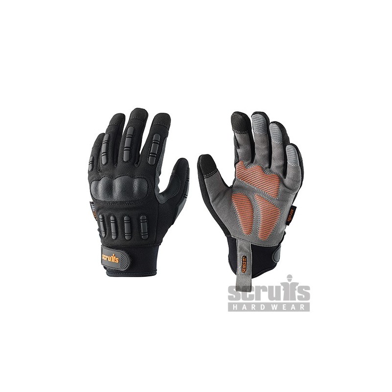 Shock impact gloves with padded palms and knuckles for increased protection. Features an Abratect panel between the index finger and thumb for durability. The index finger and thumb are suitable for touchscreen devices and the palm has a silicone palm-print for enhanced grip. The adjustable cuffs are longer in length for enhanced comfort and fit.