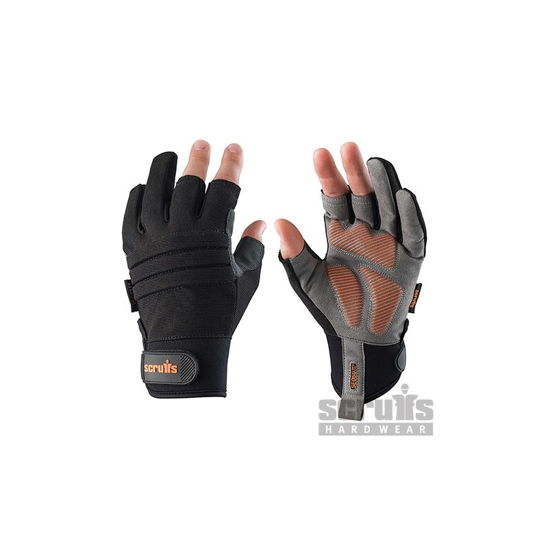 Precision work gloves with padded palms and knuckles for increased protection. Features an Abratect panel between the index finger and thumb for durability. The thumb and forefinger are exposed to allow dexterity, and the palm has a silicone palm-print for enhanced grip. The adjustable cuffs are longer in length for enhanced comfort and fit.
