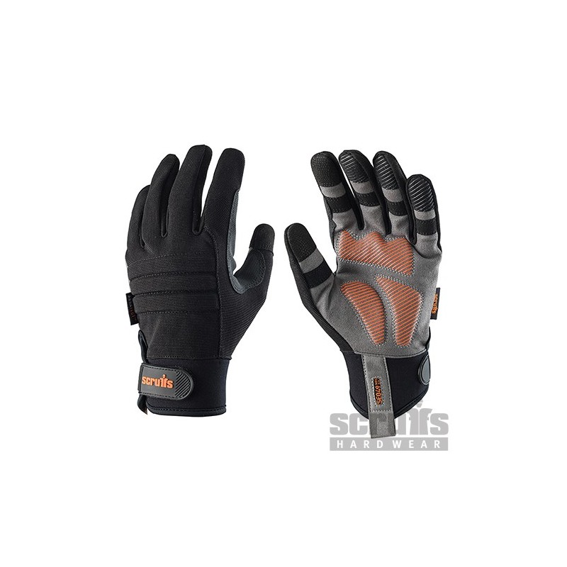 Trade work gloves with padded palms and knuckles for increased protection. Abratect panels between the index finger and thumb for durability. The index finger and thumb can also be used with touchscreen devices. Adjustable cuffs are longer in length for enhanced comfort and fit.