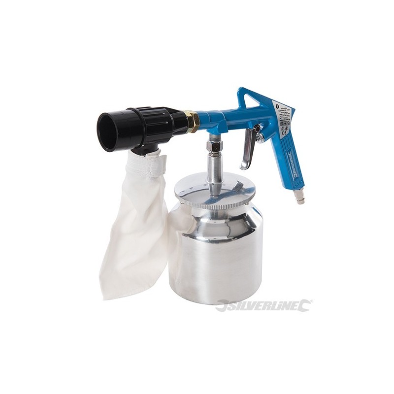Abrasive grit spray gun complete with 4 x different-sized nozzles. 850ml abrasive canister with easy detaching for quick refills. Soft rubber compound nozzles seal against flat and contoured surfaces. Ideal for detailed removal such as stone chips. Includes air sandblast gun, 4 x rubber nozzles, 1 x 500g tube of fine grit and collection bag for recycled grit. Includes UK and European 1/4" air quick connectors.