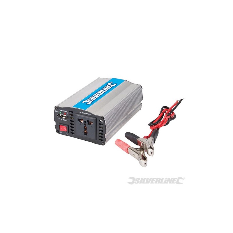 Converts 12V DC power supplies to 230V AC mains. Safety features include overload, short circuit and low battery protection with audible alarms. Perfect for use in cars, vans, caravans, boats and workshops with 12V electrical systems to run day-to-day appliances, up to the listed wattage. Includes 12V cables and spare fuse. Sockets accept compatible UK & EU appliances. Continuous rated.