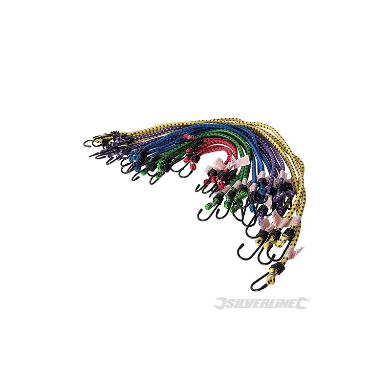 Strong, stretchable elasticated cords in heavy duty polypropylene braid with rubber-coated metal hooks. Suitable for securing large, bulky and awkwardly-shaped items during transit and for various uses around the home, garden, garage and workshop. Includes 4 of each size: 8 x 250mm, 8 x 450mm, 8 x 500mm, 8 x 600mm, 8 x 750mm. Complies with BS AU 258:1995.