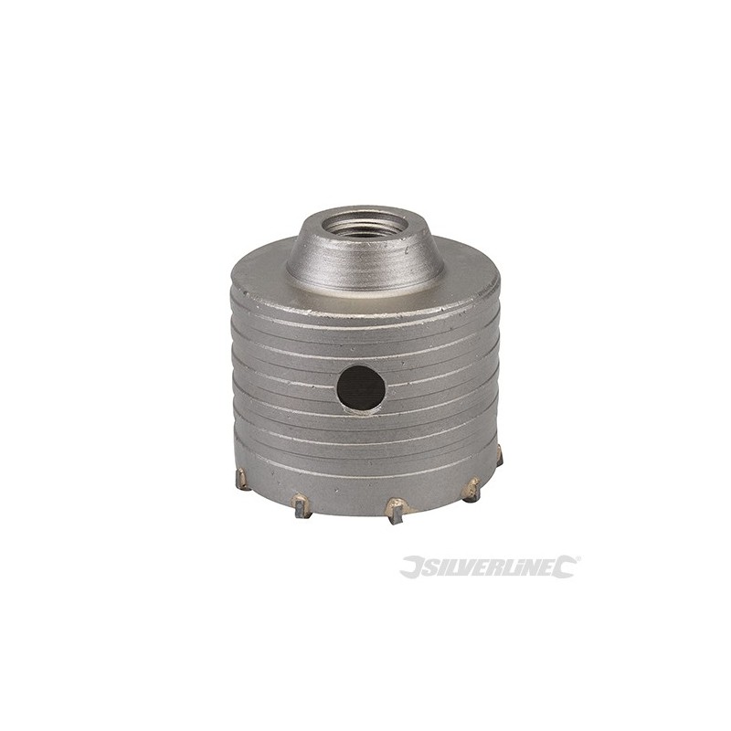 Heavy duty steel body core drill with TCT cutting tips. Ideal for cutting clean holes in burnt clay brick, sand lime brick, asphalt, concrete and aerated concrete blocks. For use with 1/2" BSP compatible arbors and drills equipped with a safety clutch. Can be used in hammer and rotational modes.