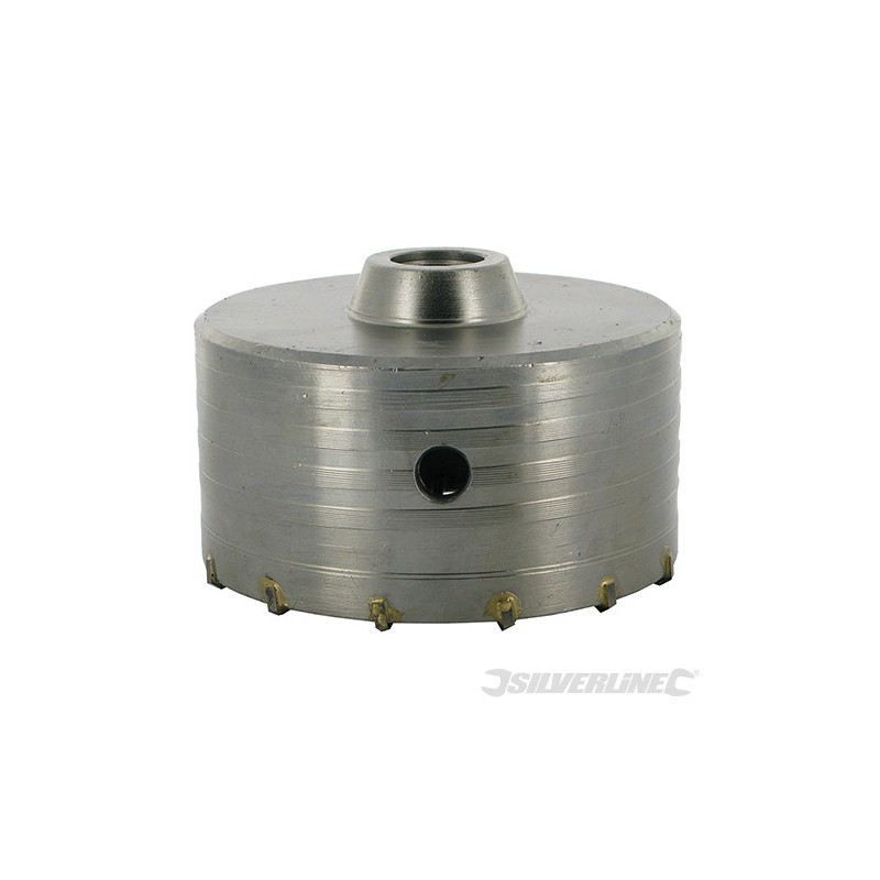 Heavy duty steel body core drill with TCT cutting tips. Ideal for cutting clean holes in burnt clay brick, sand lime brick, asphalt, concrete and aerated concrete blocks. For use with 1/2" BSP compatible arbors and drills equipped with a safety clutch. Can be used in hammer and rotational modes.