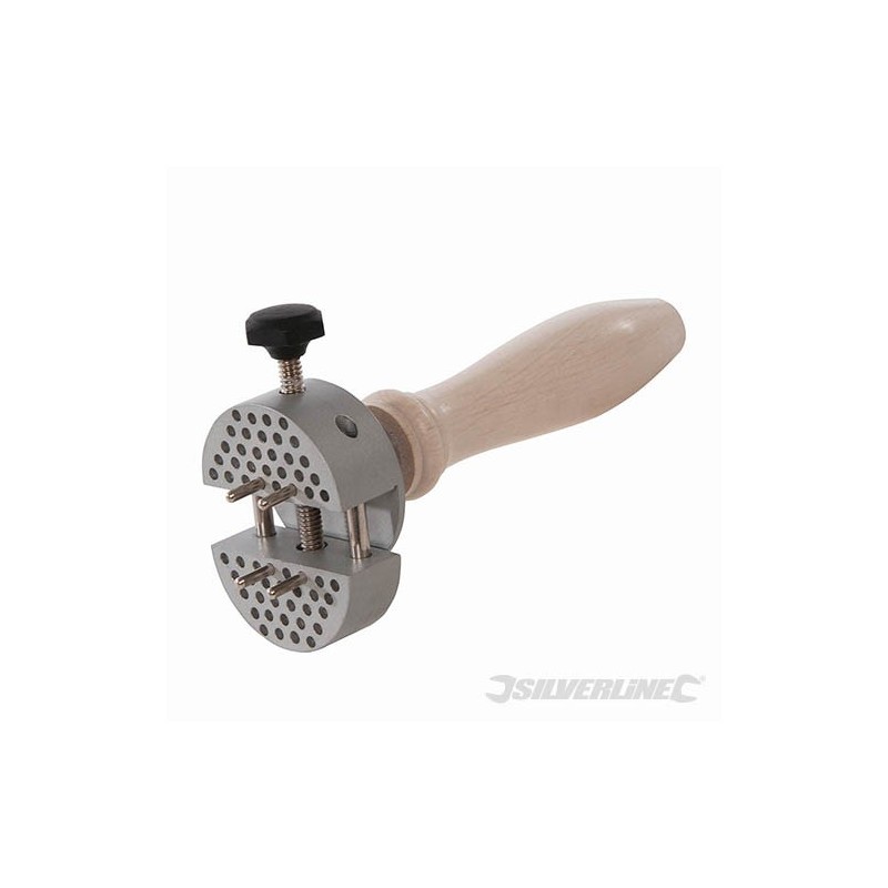 Removable handle so head can be locked in bench vice. Ideal for small and irregular shaped objects, jewellers items etc. For filing, painting, engraving, sawing, shaping work. Includes 8 steel pins to clamp odd shapes. Jaw capacity 21mm; jaw width 50mm; handle length 115mm.