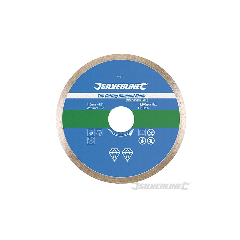 Continuous rim blade with 5mm segment height for smooth, clean cutting of ceramic and natural stone tiles, and for prolonged cutting of all types of tile. Manufactured and certified to EN13236. Compatible with 22.23mm bore static tile cutting machines and angle grinders, including Silverline and GMC. Wet or dry use. Optimum results when used wet.