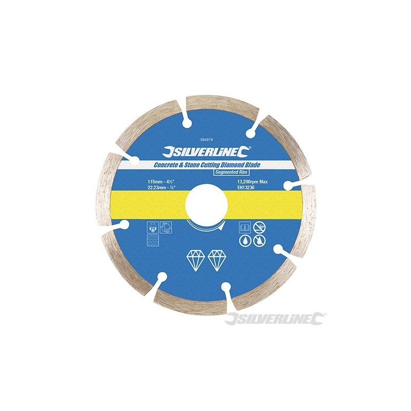 Blade with 7mm segment height for fast cutting and long life. Excellent cutting speed and blade life balance. For general building use on stone, concrete, pipes, brick, roof tiles, patio slabs and lintels. Manufactured and certified to EN13236. Compatible with 22.23mm bore angle grinders including Silverline and GMC. Wet or dry use. Optimum results if used wet.