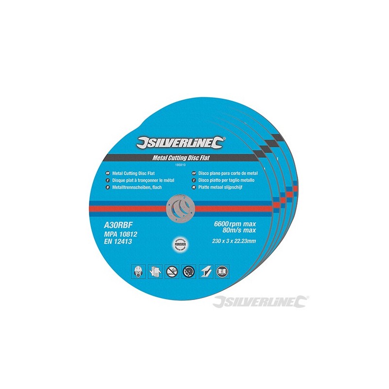 Resin-bonded glass fibre reinforced aluminium oxide metal cutting discs for cutting ferrous and non-ferrous metals. Suitable for all metal-cutting applications. Compatible with 22.23mm bore angle grinders. Manufactured to EN12413 and MPA approved. Max 6600rpm.