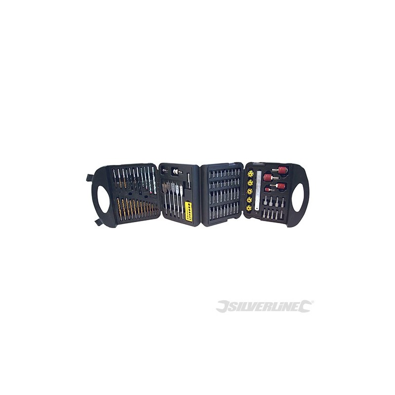 13 x HSS titanium-coated drill bits 1.5 - 6.5mm; 3 x HSS titanium-coated hex shank pilot drill bits 1.5 - 3mm; 4 x brad point wood-boring drill bits 4 - 8mm; 4 x TCT masonry drill bits 5 - 10mm; 5 x spade bits 13 - 25mm; 48 x 25mm Cr-V driver bits (slotted/Ph/Pz/Trx); 18 x 50mm Cr-V driver bits (Slotted/Ph/Pz/Trx); 9 x nut drivers 5 - 13mm; 4 x sanding drums 13 - 25mm; 12mm HSS countersink bit; 50mm quick-change bit holder, 60mm bit holder, drill gauge, and 15cm metal rule (metric).