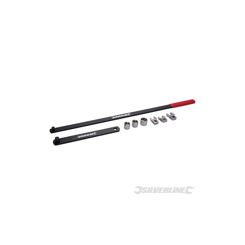 Chrome-plated and powder-coated carbon steel for corrosion resistance. Releases and tensions serpentine belt tensioners in confined, very tight spaces. Long-reach 585mm handle and 220mm extension. Includes extra-shallow 15, 16 and 18mm sockets and 13, 14 and 15mm crows foot spanners.