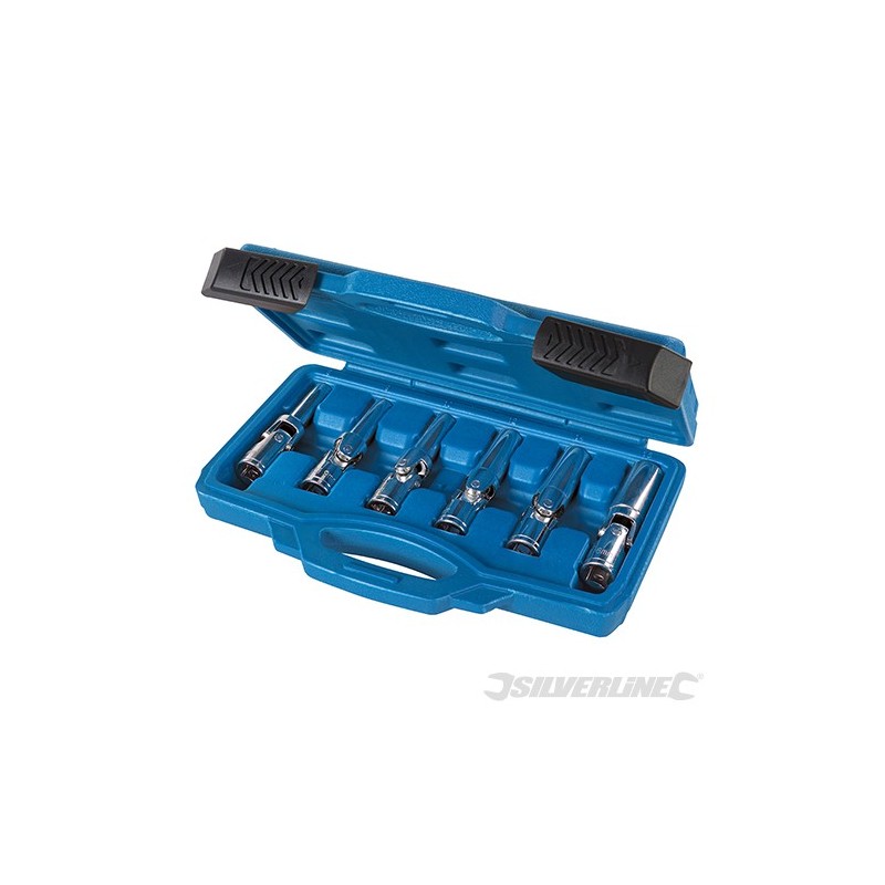Forged chrome vanadium steel sockets with double-pin type universal joint. For diesel glow plugs and petrol spark plugs. Rubber socket insert grips ceramic insulation to assist in plug extraction. Socket sizes: 8, 9, 10, 12, 14 and 16mm. Supplied in tough storage case.