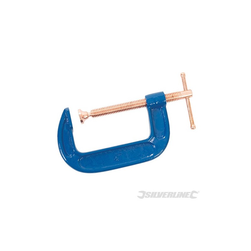 Robust cast-iron frame with steel threaded bar. Tommy bar handle for easy tightening. Swivel shoe allows for clamping irregular-shaped objects. Copper-plated thread prevents weld spatter from sticking. Reinforced shoulders provide greater strength. Corrosion-resistant frame finish.