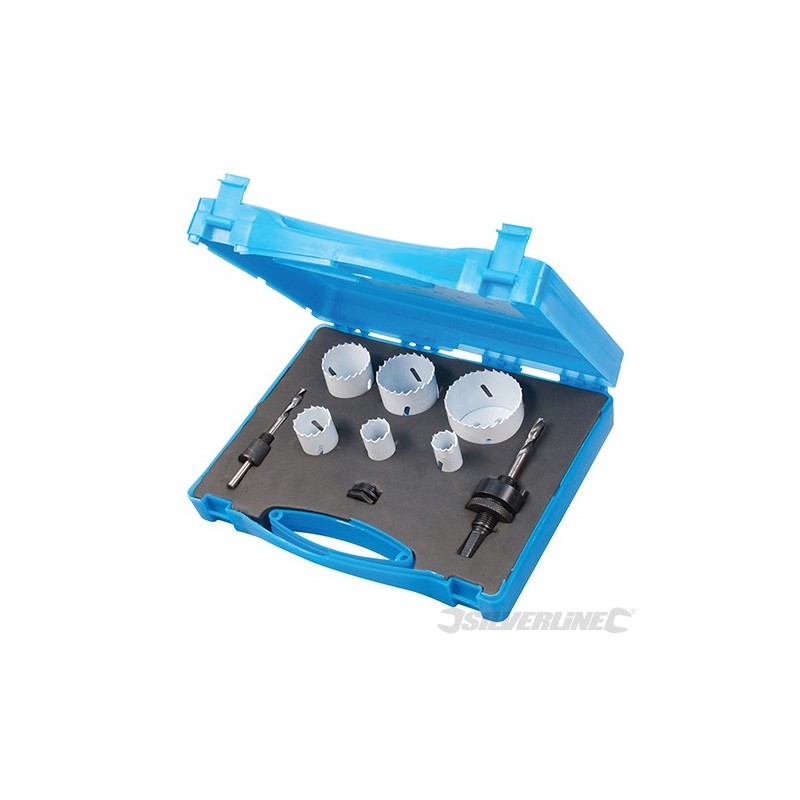 Variable pitch holesaws in bi-metal construction. Hardened HSS teeth, flexible high carbon steel backing. Used for cast iron, stainless and structural steel, bronze, copper, PVC, alloyed and non-alloyed aluminium, acrylic and wood. Contents: 19, 22, 29, 38, 44 and 57mm holesaws. Includes 2 arbors and mandrel adaptor.