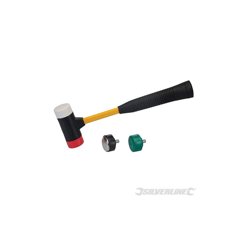 Interchangeable nylon heads and steel shaft. Face diameter 35mm. High-grip handle is resistant to oil and chemicals. Includes 3 x nylon anti-marking heads and 1 x metal-capped head.