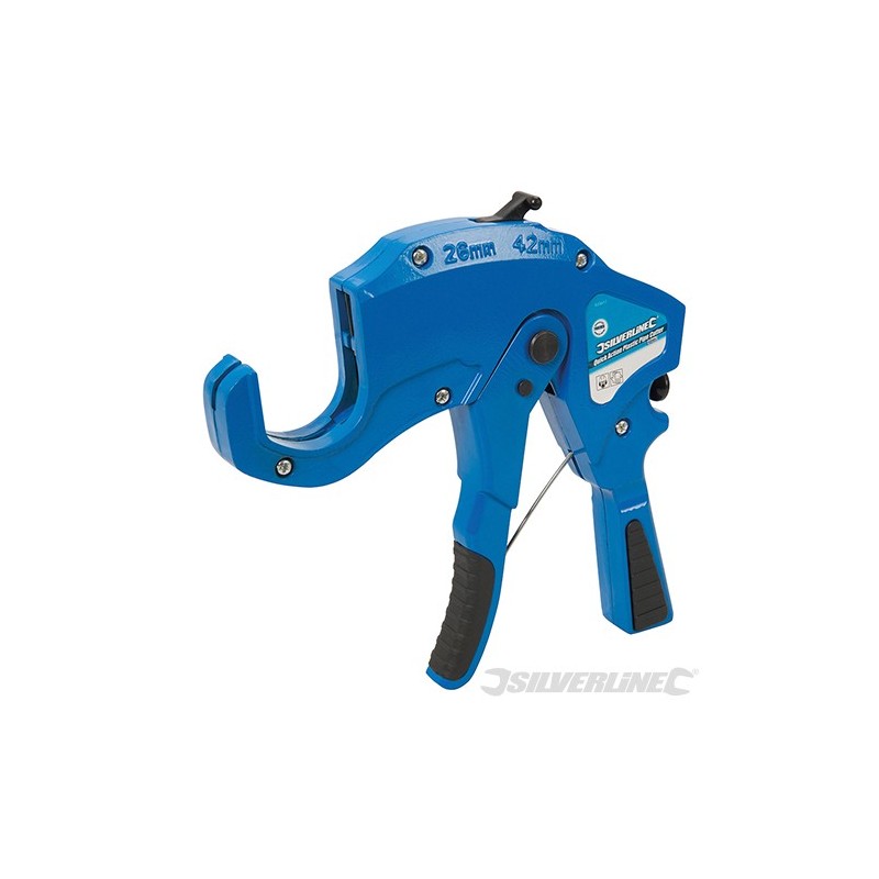 Cast aluminium body and hardened and tempered steel blade. Corrosion-resistant finish. Pistol grip with quick-action mechanism, quick blade-release button and 26/42mm dia preset switch. Cuts all types of PVC, PE, PP, vinyl and ABS plastic pipes, as well as round ducting, conduit and other plastic extrusions accurately, without crushing. Cutting capacity 42mm.