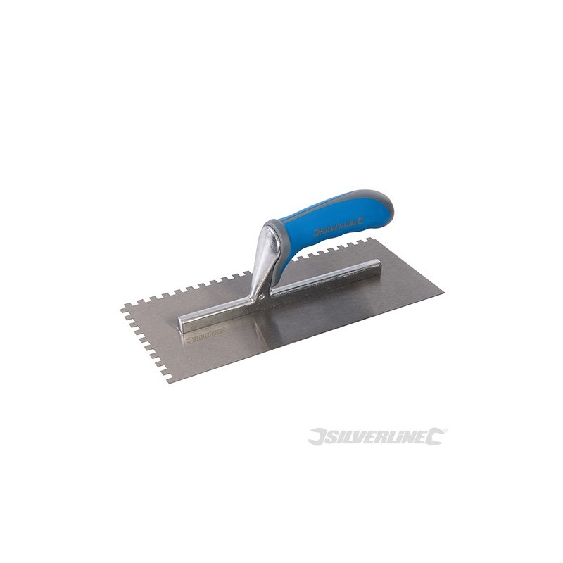 Flexible, polished, corrosion-resistant stainless steel blade with a two-piece soft-grip TPR handle, giving good knuckle clearance. Strong, 8-rivet bond between handle and blade. Allows rapid and even spreading of adhesives in tiling, flooring, cladding and carpet-laying applications.