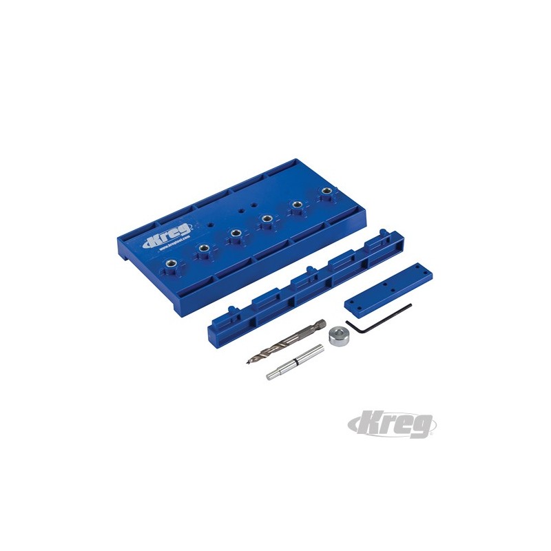 Hardened steel drill guides give precise, straight drilling for secure, 4-corner shelving. Standard 32mm (1 1/4") hole spacing with removable dual position fence for custom hole placement, and locating pin for quick, accurate spacing. Includes jig extender and ultra-sharp 5mm brad-point bit with depth collar, which can be stored on the underside of the Jig when not in use.