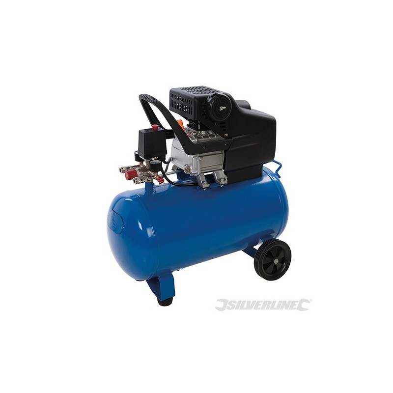 Portable air compressor, ideal for use in the garage and workshop. Reliable 1500W (2hp) motor and durable oil-lubricated, air-cooled, single-stage pump. Powers a wide variety of air tools. Max air flow of 144Ltr/min and 8bar (116psi) max working pressure. Automatic start/stop pressure switch. Extensive safety features include safety valve and thermal cut-out. Includes 2 x 3-in-1 quick connectors, air intake filter, oil bottle and portability kit.