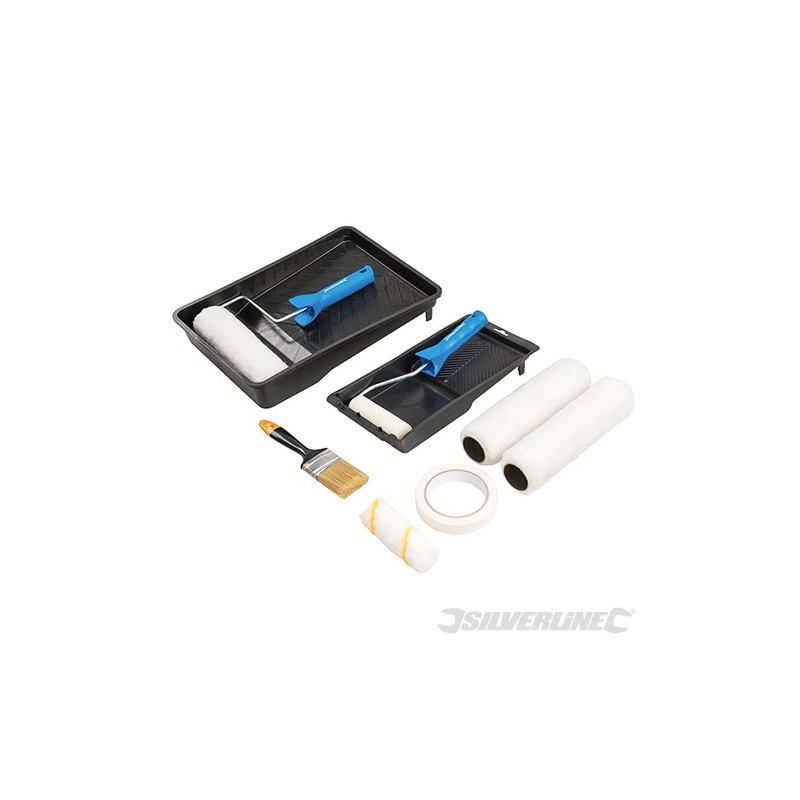 Complete decorating kit for all painting tasks around the home. For use with all types of emulsion and paint. Medium pile roller sleeves for large and small smooth-to-semi rough surfaces. Includes masking tape, 50mm paintbrush, tray, frame and 230mm and 100mm roller sleeves.