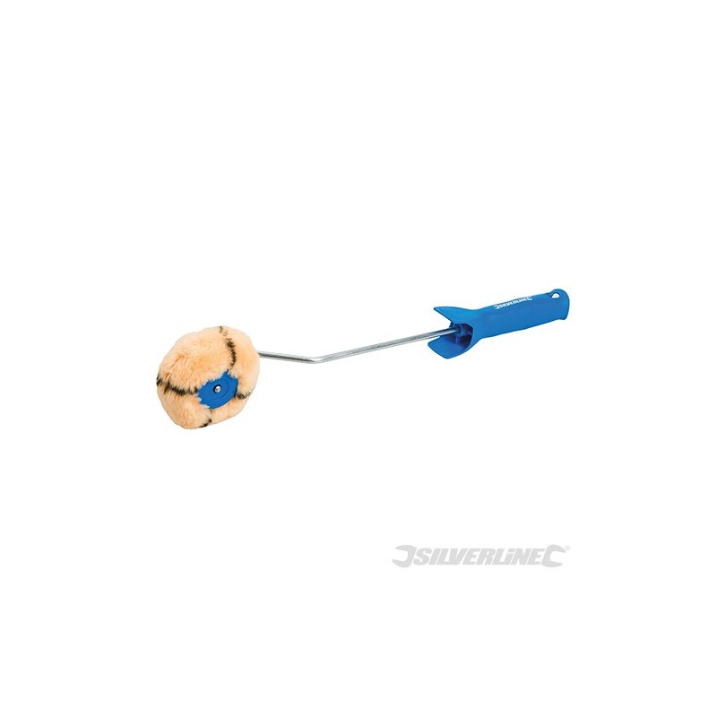 Woven acrylic roller with long-handled frame and 12mm pile corner sleeve. Allows neat paint application in tight spaces. Ideal for use in corners and painting around pipework. Suitable for solvent or water-based emulsion, wood treatments and undercoats. For use on smooth and semi-rough surfaces.