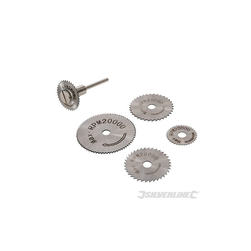 High speed steel. For intricate cutting and trimming on aluminium, brass, copper, wood and plastic. Max 20,000rpm / 3.17mm mandrel. Includes 5 x HSS saw discs: 22, 25, 32, 35 and 44mm. Compatible with most rotary tools including Silverline, GMC and Dremel.