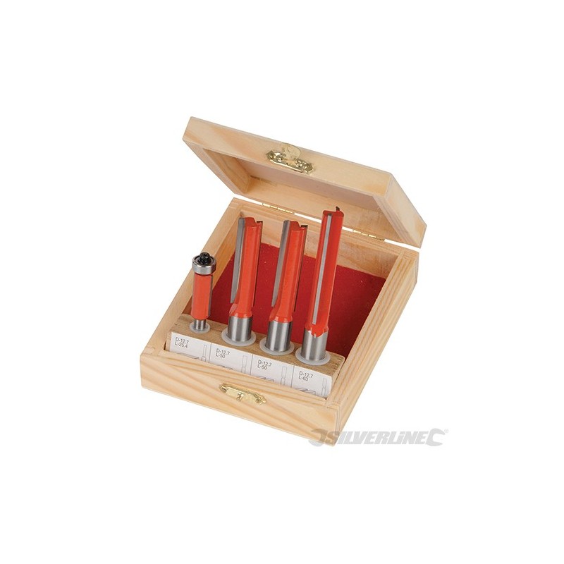 Comprehensive set for kitchen fitters. TCT cutting edges and strong, hardened steel shanks. Supplied in a wooden storage case. Includes: 1 x straight bit 63 x 12.7mm with 12mm shank; 2 x straight bits 50 x 12.7mm with 12mm shank; 1 x flush trim bit 25.4 x 12.7mm with 8mm shank.