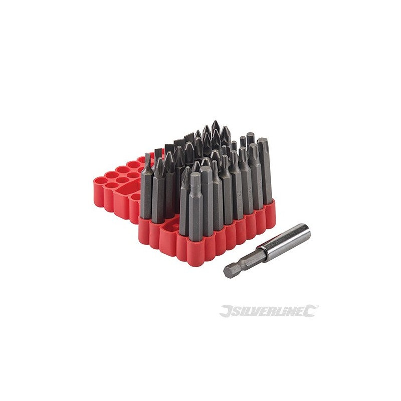 Chrome vanadium. Includes: 5 x Slotted (1 x SL3, SL4, SL5, SL6, SL7); 8 x Phillips (1 x PH0, 2 x PH1, 3 x PH2, 2 x PH3); 7 x PZ (2 x PZ1, 3 x PZ2, 2 x PZ3); 6 x Trx (1 x T10, T15, T20, T25, T30, T40); 6 x Hex (1 x 2, 2.5, 3, 4, 5, 6mm); bit holder and case.
