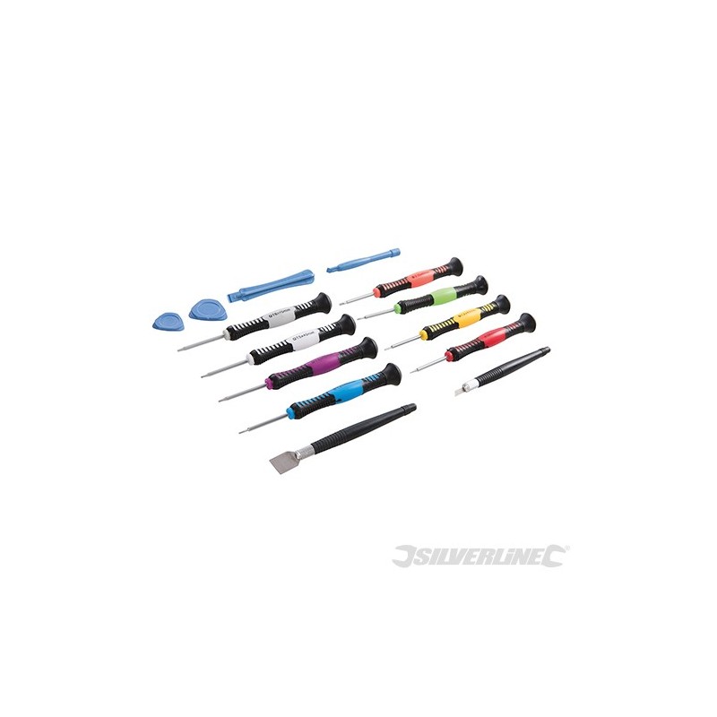 Precision steel tool set with soft-grip plastic handles. Ideal for opening and repairing mobile phones, tablets and laptop computers. Includes: slotted 2.0 x 40mm; Phillips 1.2 x 40mm; Trx T4 x 40mm, T5 x 40mm, T6 x 40mm; and Pentalobe 0.8 x 40mm and 1.2 x 40mm. Also includes straight and angled tweezers, mini scraper and scalpel, and 4 x plastic tools for opening click-on covers and phone cases.