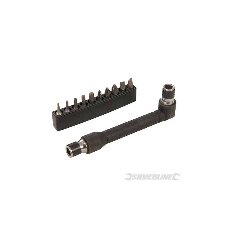 Strong, sturdy steel construction with corrosion-resistant plating and durable, soft-grip coating for control and comfort during use. Drives hard-to-reach screws with ease. Length 105 x 30mm with 1/4" hex bit holder on both ends. Includes driver, bit holder, and 10 x hex bits: slotted 4, 5, 6mm; crosshead PZ0, PZ1, PZ2, PZ3; and Trx T25, T27, T35.