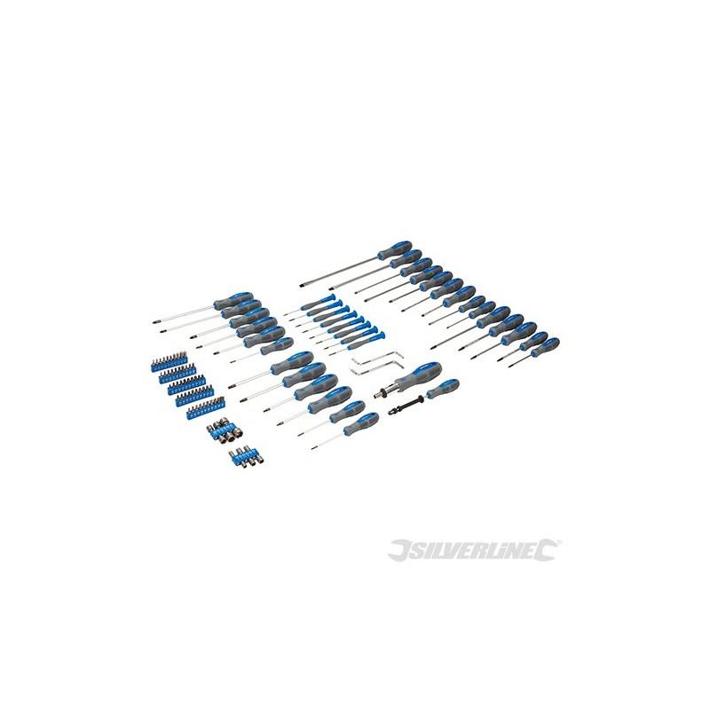 Hardened chrome vanadium blades and tips. Soft-grip handles. Includes drivers: 9 x slotted (3 x 75, 4 x 100, 5 x 75, 5 x 100, 6 x 100, 5 x 150, 6 x 150, 8 x 200, 8 x 250mm); 6 x Pozidriv (PZ0 x 75, PZ1 x 75, PZ1 x 100, PZ1 x 150, PZ2 x 100, PZ2 x 150mm); 6 x Trx (T8 x 75, T10 x 75, T15 x 75, T20 x 75, T25 x 100, T30 x 100mm); 5 x square (S0 x 75, S1 x 75, S1 x 100, S2 x 100, S3 x 150mm), 2 x offset (SL6 x PH2, SL5 x PH1); 8 x precision (SL2.5 x 50, SL3.0 x 50mm, PH00 x 50, PH0 x 50, T6 x 50mm, T7 x 50, T8 x 50, T9 x 50mm); 1 x slotted screwdriver with screw holder 4 x 100mm and 1 x ratchet driver. Supplied with 12 x nut drivers (4.0, 5.0, 5.5, 6.0, 6.0, 7.0, 8.0, 9.0, 10, 11, 12, 13mm) and 50 x driver bits (10 x slotted, 10 x Pozidriv, 10 x Phillips, 7 x Trx, 3 x square and 10 x hex).