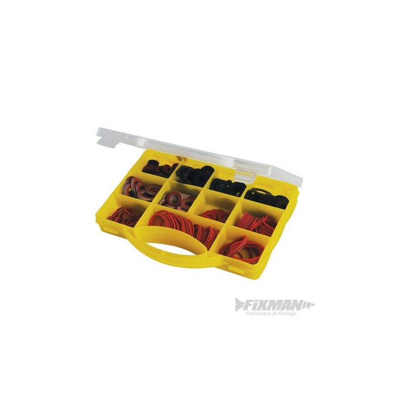 Red fibre and black rubber washers suitable for plumbing applications, and for use as buffers and packers. Includes shower hose, inlet hose and drain valve washers. Includes top of tap body washers No. 1, No. 2, No. 3 and No. 4, fibre tap connector washers 15 and 20mm, fibre washer No. 53, fibre washer for flexible tap connector 15 and 22mm, hose union washer 3/4", inlet hose 3/4", shower hose 1/2", fibre and rubber drain-off cock washer. Handy storage case with compartments.
