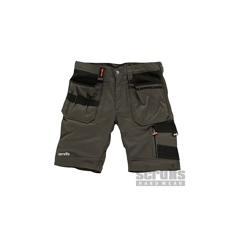 Hard-wearing work shorts designed for lasting comfort. Regular fit for classic look. Lightweight twill fabric with heavy-duty canvas pocket reinforcements and triple-stitched seams for durability. Features cargo pocket, rule pocket, mobile phone socket and secure zipped pocket. Hammer loop, tool loops and D-ring for transporting tools and accessories while on the job. YKK zipped fly. 65% polyester, 35% cotton, 250gsm.