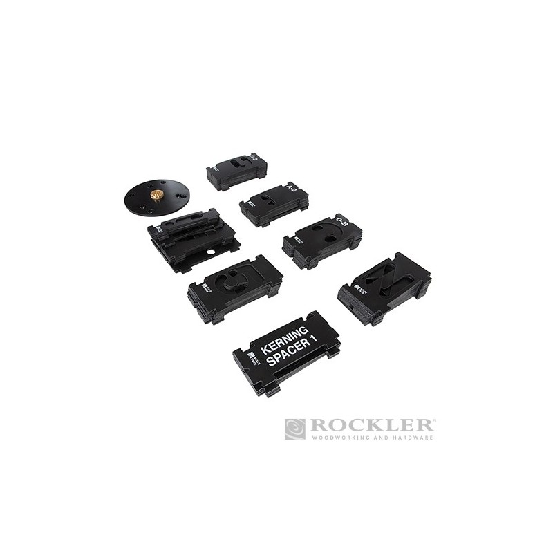 Produces professional signs using templates and a router. Templates interlock and are mounted using painter tape. Adjustable kerning allows neat, even spacing between letters. Includes 99 template pieces including letters, numbers, symbols, and kerning spacers. Also includes a high-quality brass guide bushing and a universal router base to fit all Triton routers. Template thickness 2mm (3/32"). Available in 1-1/2", 2-1/4" and 3-3/8" sizes. Compatible with Rockler Sign Router Bits (sold separately), as follows: 1-1/2 compatible with 3/16 Sign Router Bit, 2-1/4 compatible with 3/8 Sign Router Bit, 3-3/8 compatible with 5/8 Sign Router Bit.