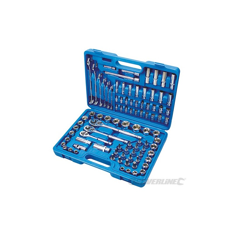 Hardened and tempered chrome vanadium steel set of metric and imperial spanners and sockets. Mirror-polished finish. 6 x spanners 10-19mm; 8 x 1/4 deep sockets 6-13mm; 4 x 3/8 deep sockets 10-13mm; 17 3/8 socket Trx, slotted, Phillips and PZD screwdriver bits; 1/4; 3/8 and 1/2 ratchet handles; 16 and 21mm spark plug sockets; 3 x extension bars 2 x Œ, 3 x 3/8, 6 x 3/8; 1 x 3/8 universal joint; 10 x 1/4 metric sockets 4-13mm; 10 x 1/4 imperial sockets 5/32-1/2; 9 x 3/8 metric sockets 10-119mm; 7 x 3/8 imperial sockets 3/83/4; 5 x 1/2 metric sockets 20-27mm; 5 x 1/2 imperial sockets 25/3211/16". Strong carry case.